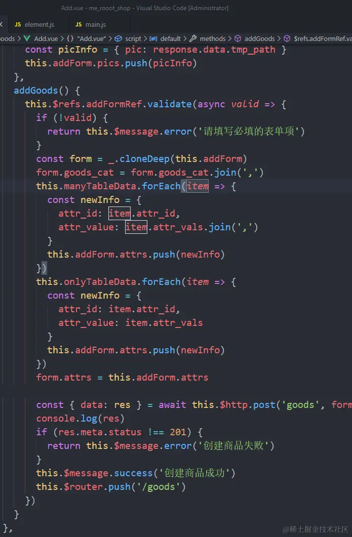 执行过程和思路:1.点击按钮,进行整个表单的验证,如果没有填写则提示用户-->2.填写都正确后,要记性对象深拷贝【因为某对象已经被使用了,再次复用时,会改变数据类型,就是将原本数据再原封不动的复制一份】,lodash深拷贝一份对应对象数据,再对存取分类id数组进行字符串的格式化,存储到原数组中;循环商品参数和商品属性数组,将对应id和值存取到对应变量中,后期请求数据要使用到,将被拷贝的数据复制到深拷贝的对象中-->3.开始发送添加商品请求,如果没有添加成功,则提示用户,添加成功则提示用户添加成功,并进行路由跳转,跳回到商品列表页,商品列表页会自动刷新页面数据
