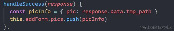 (3)上传图片成功后回调上传成功函数,将对应图片的地址存储起来,方便后面发起添加商品,因为该数据在后续添加商品请求中会使用到,上传图片生成后回调函数:on-success,回调是个函数,有个参数是response,里面返回的都是上传成功后的该图片的信息,取出数据分解存储,把分解出来的路径push到实现定义好的数组中,方便后面使用,ps:具体使用看官文文档