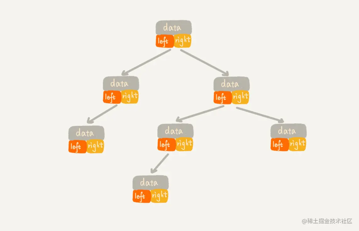 每个节点有三个字段,其中一个存储数据,另外两个是指向左右子结点的指针。我们只要通过根节点,就可以通过左右子结点的指针,把整棵树都串起来,如图所示。大部分二叉树都是通过这种结构来实现的。