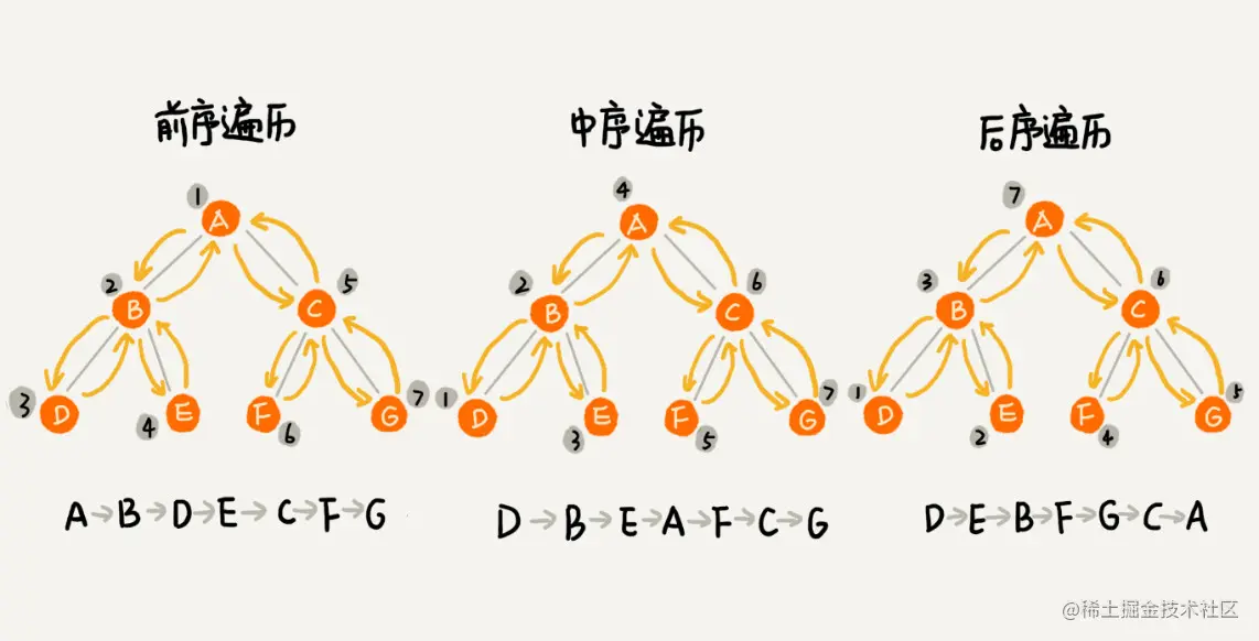 如何将所有节点都遍历打印出来呢?经典的方法有三种,前序遍历、中序遍历和后序遍历。其中前、中、后序,表示的是当前节点与它左右子树节点遍历打印的先后顺序。