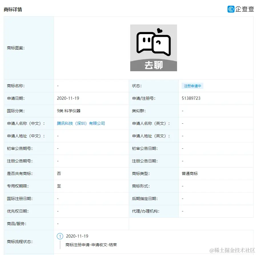 IT之家 11 月 25 日消息 企查查 App 显示,腾讯科技(深圳)有限公司于 11 月 19 日申请了”去聊”商标,核准注册在 9 类科学仪器和 42 类设计研究中。目前,尚无更多 “去聊”相关信息。