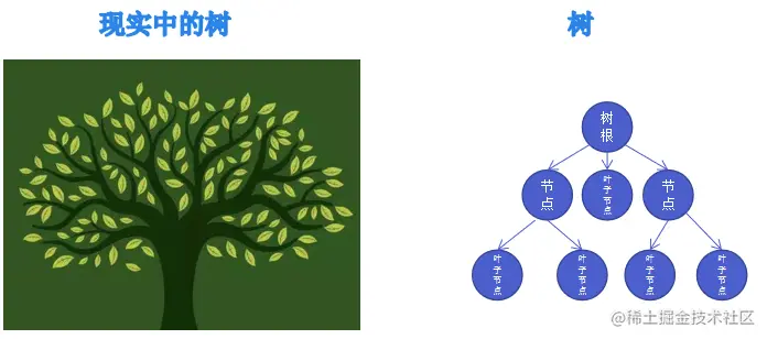 数据结构中的树,把现实中树的根抽象为根结点,树枝抽象为边,树枝的两个端点抽象为结点,树叶抽象为叶子结点,然后整体在整体翻转180度,就得到了数据结构中的树。