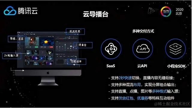 在直播制作方面,我们提供了云导播台。云导播台的优势就在于操作简单,功能上支持2s快速切换,直播内容无缝衔接。同时,云导播台是基于互联网的,所以非常容易支持一些互联网活动,比如支持直播过程中的实时发放红包和优惠券。