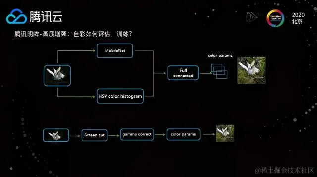在色彩增强方面,这里将MobileNet的特征与HSV色彩直方图相结合,作为一个融合特征去分类训练,通过这个模型来获取调整对比度、亮度和色度的参数。这样处理后的模型比较小,速度也非常快,有利于大规模落地使用;其次,它不是端到端的处理,所以整个过程是可控的,由于颜色的变换对于人眼来说是非常敏感的,因此在落地的过程中,我们也更倾向于使用中间过程可控的方式。