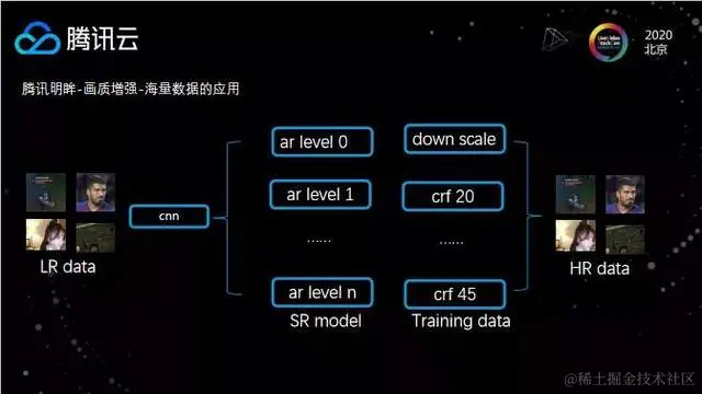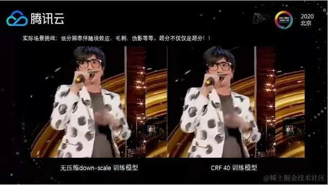 在实际落地的过程中,还有很多新的问题需要关注和解决。首先训练数据非常重要,以上图为例,左边的视频已经有非常多噪点和模糊的情况,如果像实验环境下的视频一样使用无损的下采样数据进行训练,效果其实是微乎其微的。针对这样的情况,我们会把图像进行下采样,然后用比较高的CRF值(比较差的编码质量)对这个图像进行编码,这样训练数据中就有很多的噪点、伪影信息,训练出来的模型也会有比较好的去伪影能力。