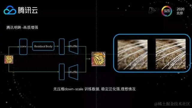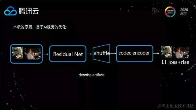 首先分析下模糊方案的缺点,模糊去噪的处理过程中,并不知道编码器的倾向喜好,会按照去噪算法统一的磨平细节,而没有考虑编码过程。所以我们思考是否可以基于AI视觉的技术,做一个reduce artifact的filter。我们希望这个filter能够主动磨掉一些细节,使视频和编码器有更好的亲和性,也就是说这个视频会更容易被编码器压缩,与此同时它不会把人眼关注的、明显的边缘磨掉,也就是在保证主体清晰度的前提下,编码客观指标也不会大幅下降。我们在模型训练的过程中,引入了编码过程,shuffle后还原的图像不直接计算loss,而是进行一次视频压缩,用压缩后的图像来计算loss。低码率压缩时,先经过reduce artifact处理,再进行转码,画面的人眼感官会有一个显著的提升。