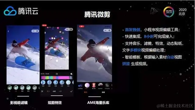 腾讯微剪,首发独创的小程序视频编辑工具,快速集成,支持音乐、滤镜等特效 。支持智能模板,根据输入素材自动视图拼接生成视频。
