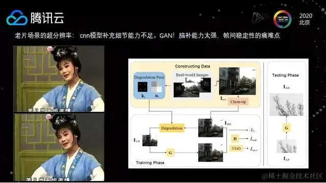 对于一些老片的场景,基于ResNet和CNN的超分模型,虽然可以提升视频质量,但是其对视频细节的捕捉能力还不够强,上述模型可以把一个非常差的视频提升到还不错的程度,但与目前所认可的高清还有一段差距。这种老片的视频场景,可以通过GAN网络来优化,GAN网络具有比较强的细节补充能力,这种补齐比较符合人眼感官,带来视觉效果的提升。当然,GAN网络在实际落地的过程中,还有很多需要解决的问题,首要问题就是GAN的不稳定性和帧间一致性的优化。