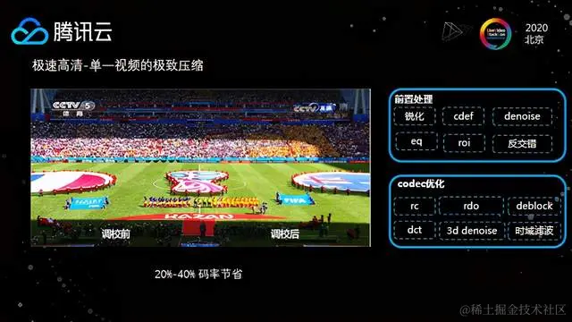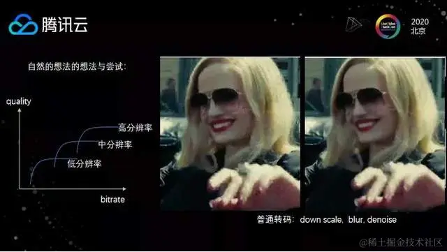 首先简单对腾讯云极速高清产品做个定义,简单而言它是一个结合了前置处理、编码器优化的整体视频压缩解决方案。给客户提供更低码率的同时,保证主观感受不变差,甚至更好的主观感受。