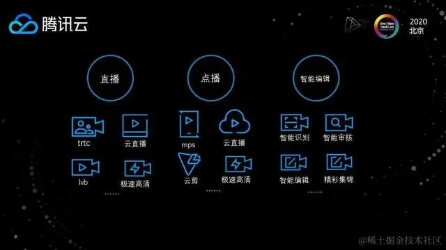 上图是腾讯视频云在直播点播媒体处理、智能编辑等方面的产品矩阵,可以看到,无论是直播、点播中应用的视频压缩和画质修复技术,还是智能编辑中应用的审核、识别、标签等技术,都离不开AI的支持。