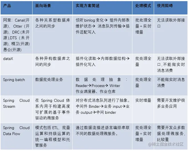 基于上述这些问题,我们希望寻求维护成本更低、开发效率更高的解决方案。为此我们对数据同步相关产品进行了调研,结果发现大部分都是面向异构数据库的同步,或者只能支持批处理任务,抑或不能方便扩展访问外部接口, 综合下来并没有发现能较好适配我们业务场景的。当然调研的这些产品很多特性为我们提供了重要的参考,比如 dataX 的插件机制和 Spring Cloud Data Flow 的编排能力给了我们很多启发。
