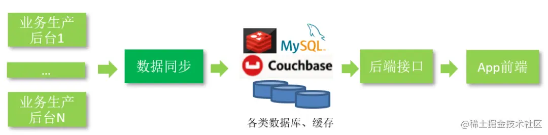 · **数据同步:**业务部门通过数据同步服务将生产后台产生的数据进行转换、聚合等加工处理,写入到数据库和分布式缓存里;