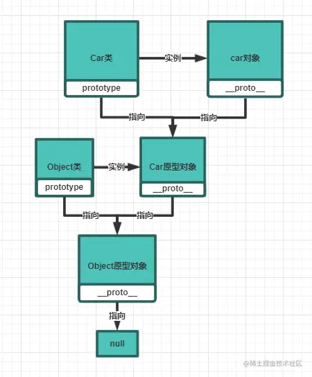 //Car类的原型指向是Object类的原型,