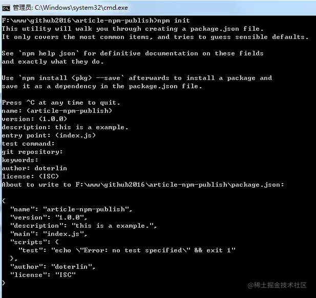 name要注意填,它将是你发布出去的npm包名,如果不小心填错了,可以直接在新建好的package.json修改name字段。