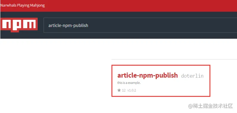 这样你就可以在www.npmjs.com搜索并找到你刚才发布的npm包名(例如我的是:article-npm-publish,如果需要登录,请使用刚才你在控制台注册的账号):