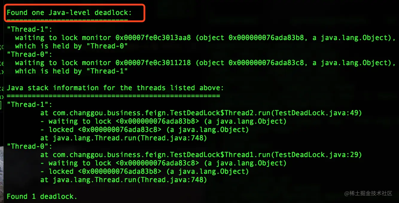 jstack查找除了发生死锁进程的原因, 以及对应的堆栈信息。