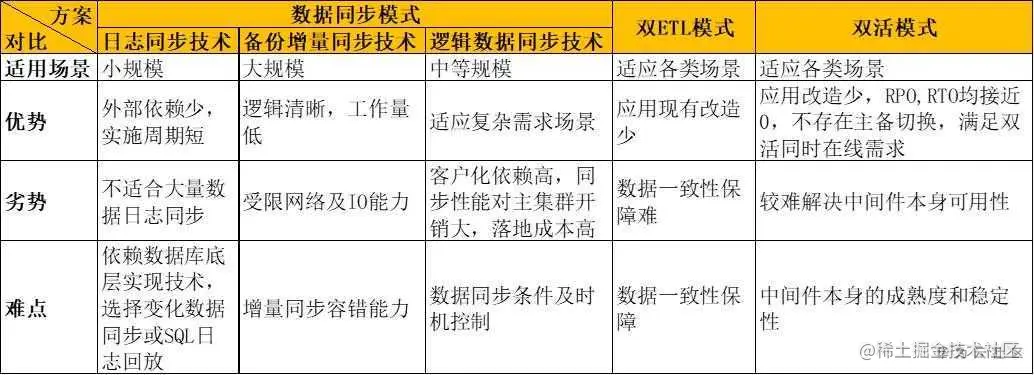 鉴于数据仓库存在大量数据吞吐,针对不同数据库、不同可用性要求,若需要设计双集群冗余设计,可选技术手段分别有数据同步模式、双ETL模式、双活模式,具体探讨如下: