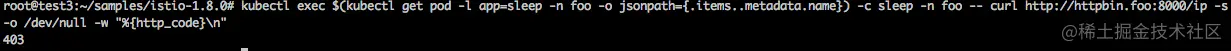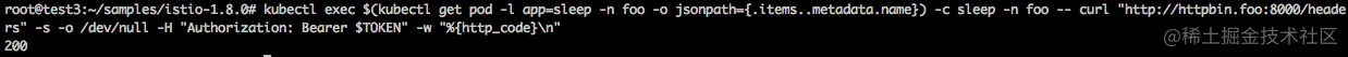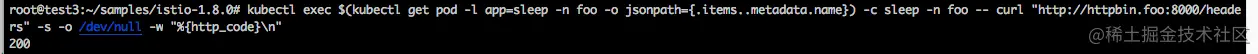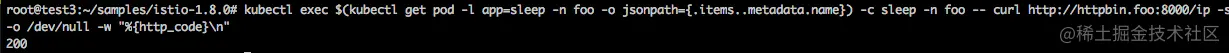 kubectl exec $(kubectl get pod -l app=sleep -n foo -o jsonpath={.items..metadata.name}) -c sleep -n foo -- curl http://httpbin.foo:8000/ip -s -o /dev/null -w "%{http_code}\n"