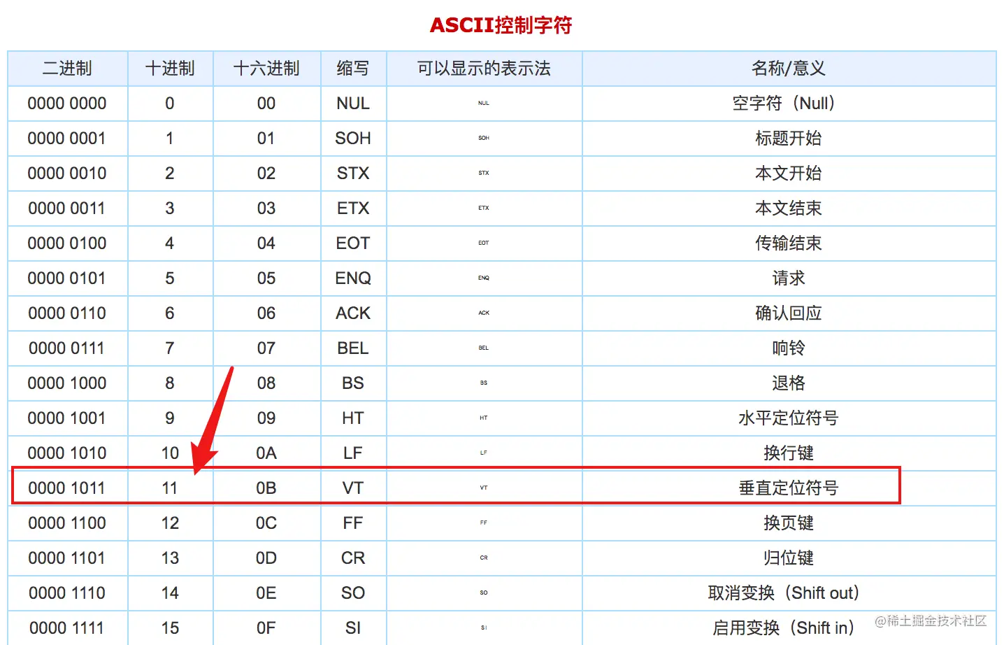 对照查看 ASCII 码表,11 对应的是一个垂直定位符号,这就能解释,为什么是阶梯状的输出字符串。