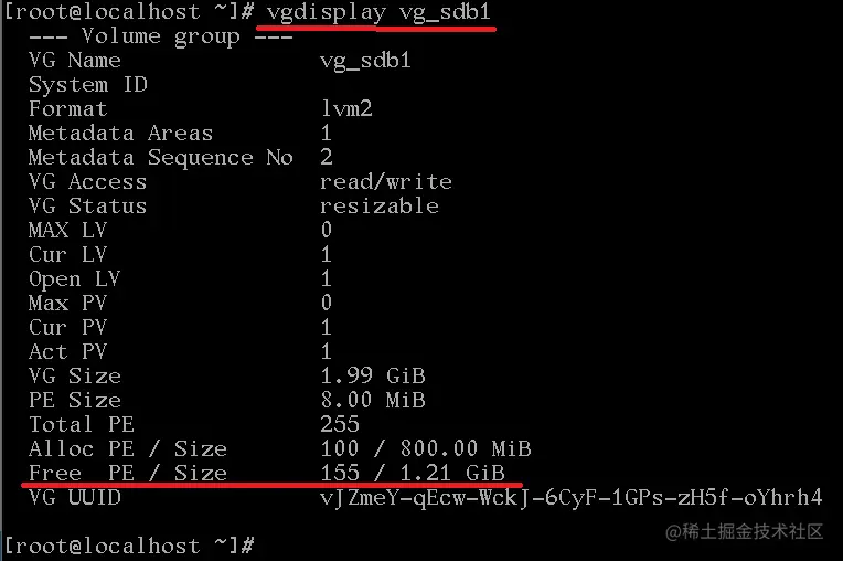 #查看卷组剩余空间 vgdisplay vg_sdb1