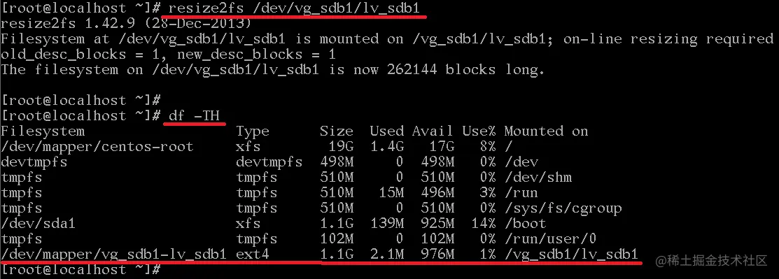#更新逻辑卷的系统文件 resize2fs /dev/vg_sdb1/lv_sdb1 #查看文件系统大小 df -TH