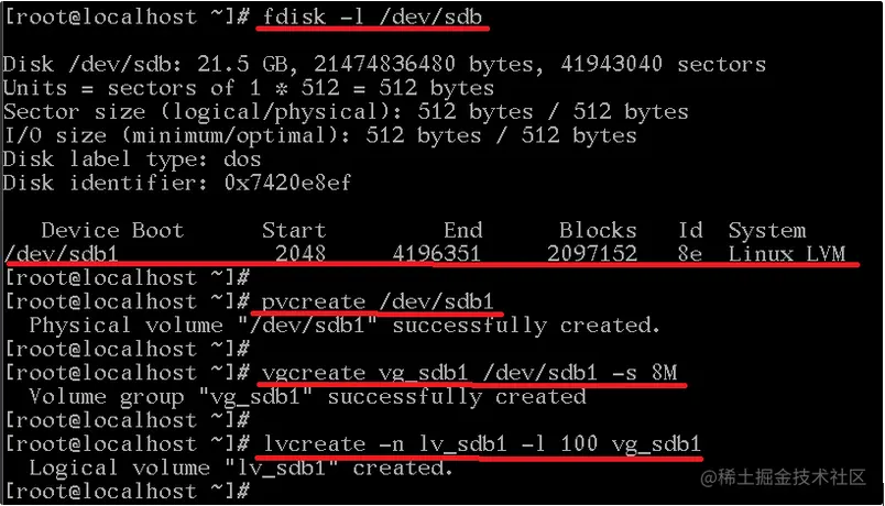 fdisk -l /dev/sdb1 pvcreate /dev/sdb1 #创建物理卷 vgcreate vg_sdb1 /dev/sdb1 -s 8M #创建卷组,单元为8M lvcreate -n lv_sdb1 -l 100 vg_sdb1 #创建800M的逻辑卷