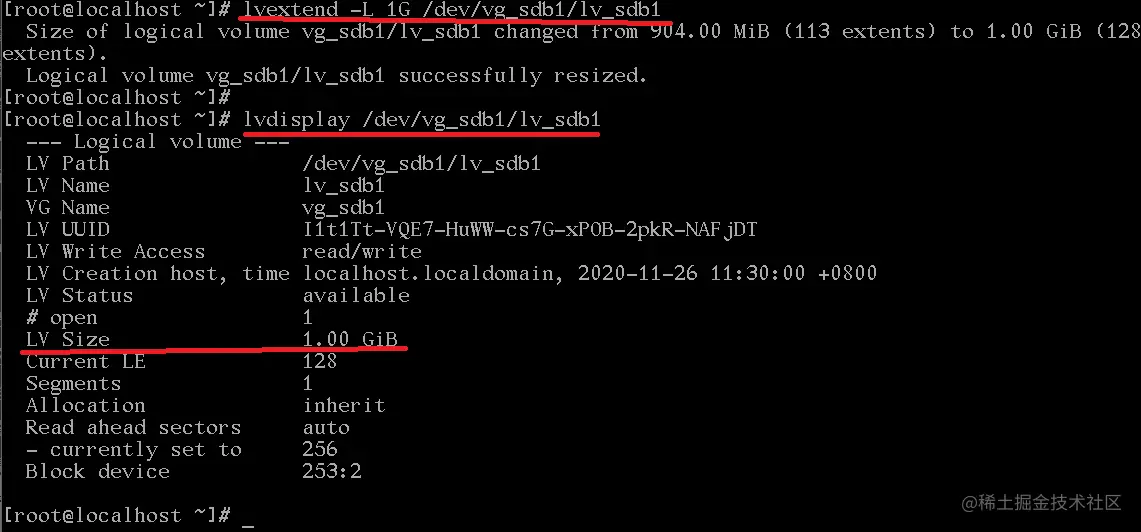 lvextend -L 1G /dev/vg_sdb1/lv_sdb1 #查看逻辑卷大小 lvdisplay /dev/vg_sdb1/lv_sdb1""" -L 1G #扩展至1G -L +1G #增加1G """