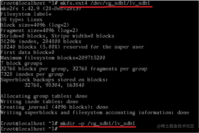 mkfs.ext4 /dev/vg_sdb1/lv_sdb1 #把文件格式化成ext4 mkdir -p /vg_sdb1/lv_sdb1 #新增挂载目录