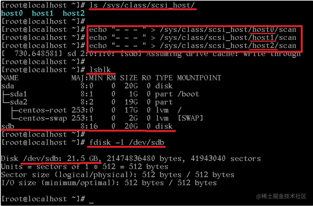 #对磁盘进行扫描 ls /sys/class/scsi_host/ echo "- - - " > /sys/class/scsi_host/host0/scan echo "- - - " > /sys/class/scsi_host/host1/scan echo "- - - " > /sys/class/scsi_host/host2/scan