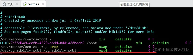 """ 把文件/dev/vg_sdb1/lv_sdb1改成UUID也可以实现自动挂载(blkid查看UUID);