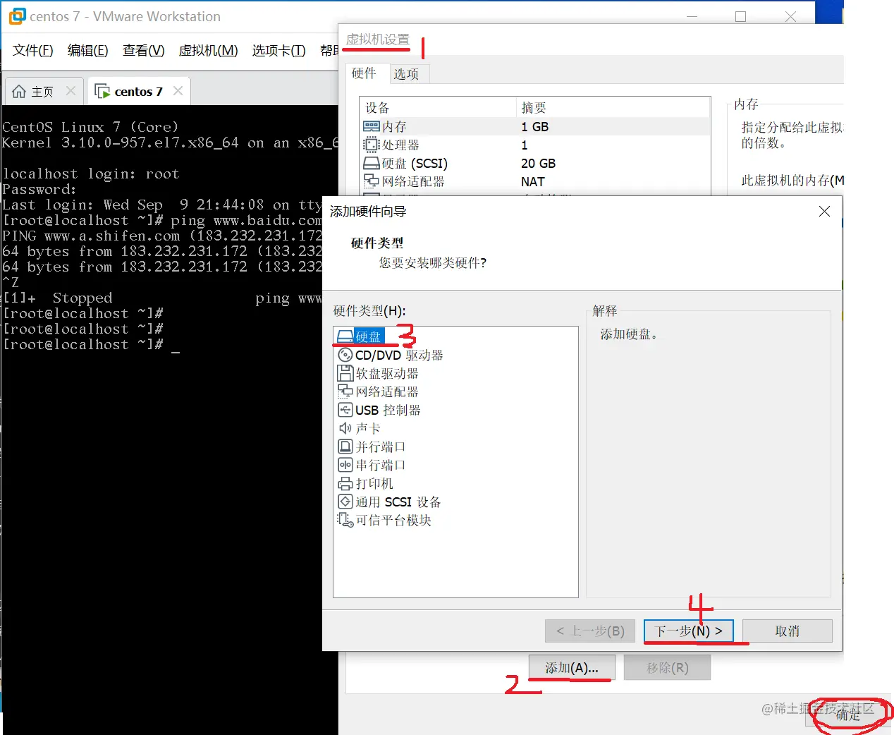 在虚拟机中新增一个20G的硬盘,记得最后要点”确定“按钮
