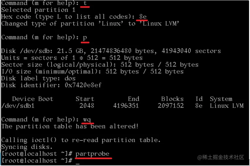 wq #保存写入并退出 partprobe #重读分区""" m 显示帮助 d 删除分区 l 列出分区类型 """