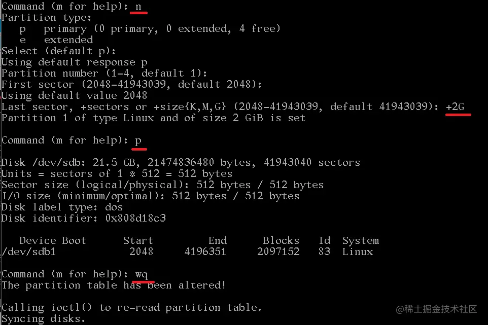 fdisk /dev/sdb p n #新建分区 p 2G p wq #写入并保存退出
