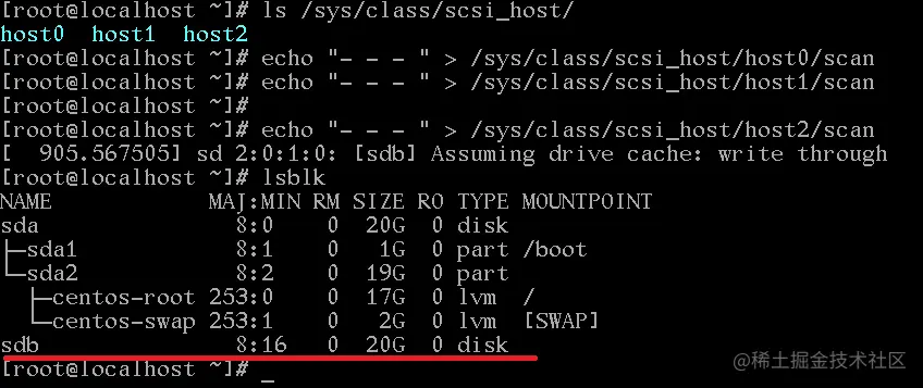 echo "- - -" > /sys/class/scsi_host//host0/scan echo "- - -" > /sys/class/scsi_host//host1/scan echo "- - -" > /sys/class/scsi_host//host2/scan