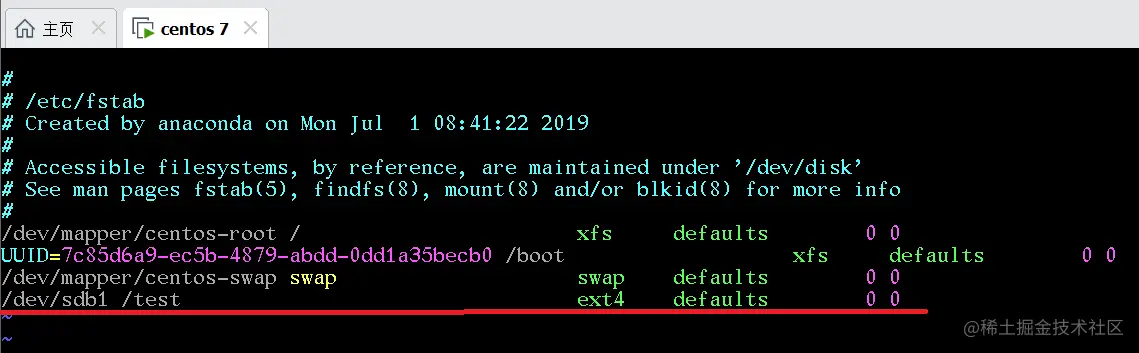 vim /etc/fstab /dev/sdb1 /test ext4 default 0 0