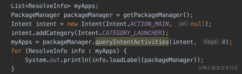 - <Android 11(Api Level 30):应用可以通过该方法查询设备上所有符合参数intent的Activity列表。