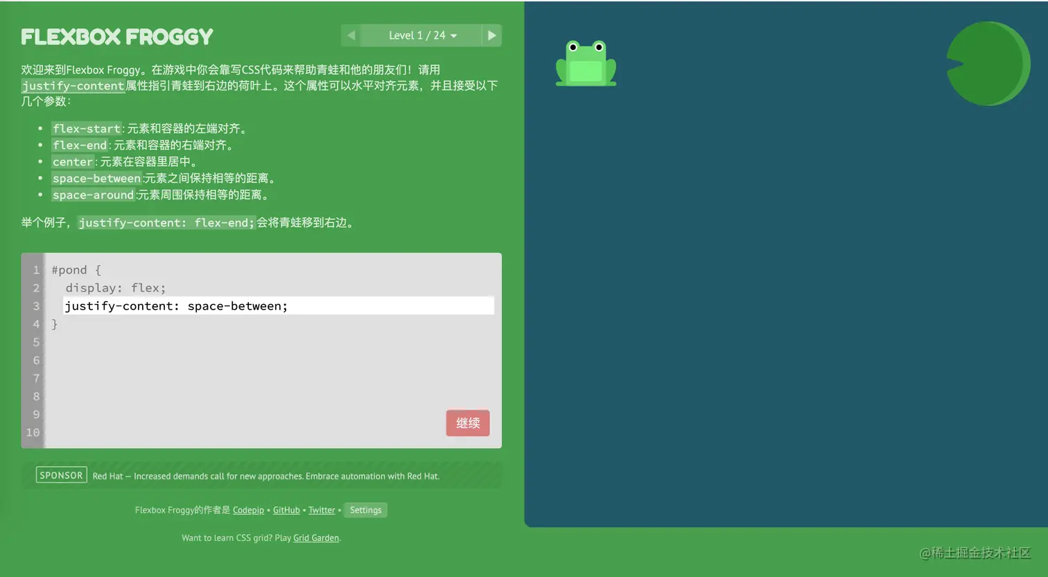 网上冲浪时候,突然看见一个用于学习CSS中flexbox布局的游戏,名为Flexbox Froggy。游戏的目的是通过编写CSS代码来帮助青蛙爬上他们的睡莲。看看您是否可以击败所有关卡!