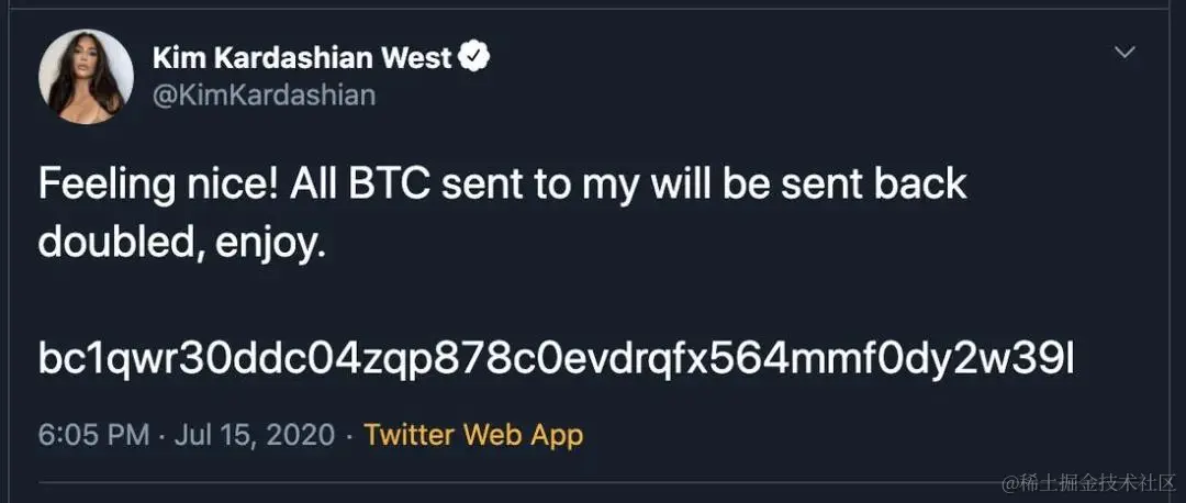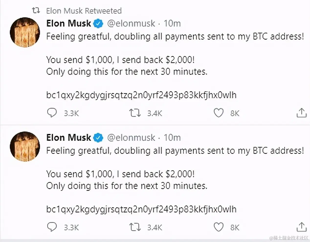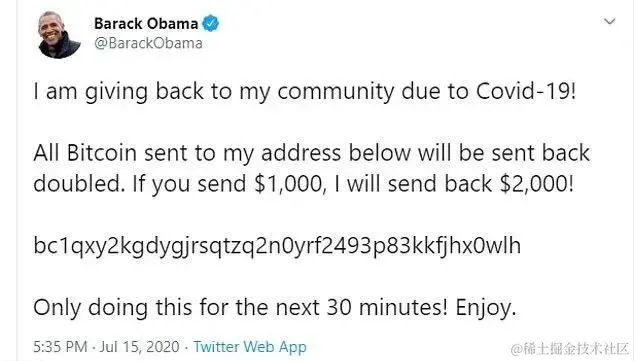 2020年7月15日,包括奥巴马、比尔·盖茨、马斯克、贝索斯等多位知名人物同时发推特表示“做善事”,任何人向他们的比特币钱包地址转账,都能收到“双倍奉还”。