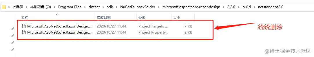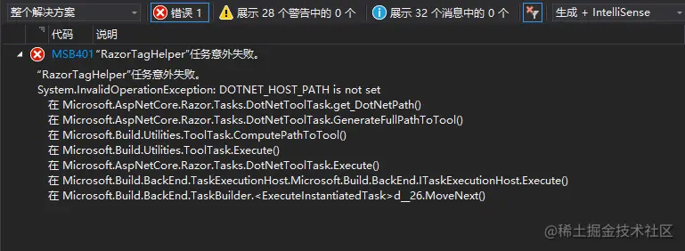 MSB401 "RazorTagHelper"任务意外失败 职业IT人 2020-11-26 820 阅读1分钟 vs2019升级到16.8+之后,编译项目报“razortaghelper”任务意外失败的错误。 为了体验.net 5,把vs升级到了最新版本16.8+,然后编译原来的项目(.net core 2.2),报了以下错误: 解决方法如下: 删除C:\Program Files\dotnet\sdk\NuGetFallbackFolder\microsoft.aspnetcore.razor.design\2.2.0\build\netstandard2.0 目录下的文件