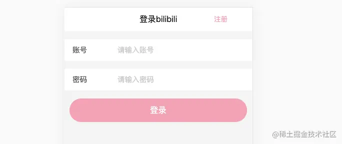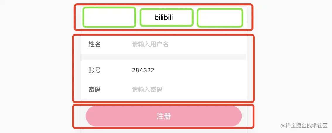 注册页面如下所示:可以分为title头部、输入框、按钮三个部分。