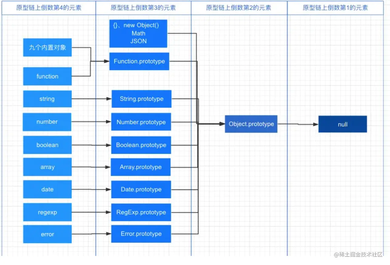 当查找某一个属性的时候,首先会在它本身查找。没有的话回去它的_proto_(即构造函数的prototype)上查找,没有找到的时候会层级向上查找,直到追溯到Object.prototype。其实也就是说每个对象都是继承自Object.prototype,而Object.prototype的原型是null,null没有任何的属性和方法