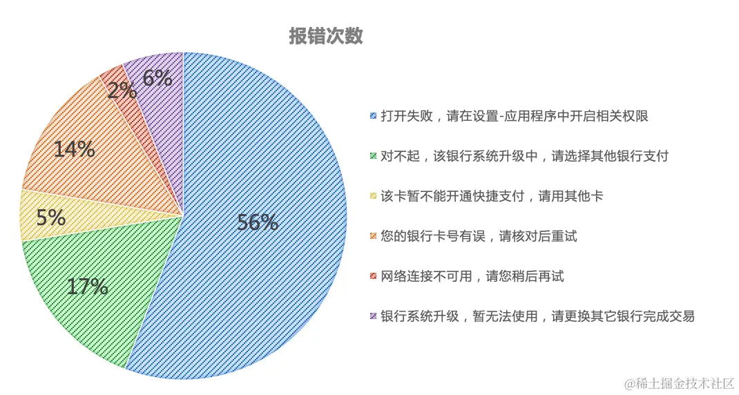 通过对用户行为数据的报错内容分析发现,用户在“发起绑定银行卡”到“绑卡完成”的过程中,提交银行卡号环节有较大流失,原因可能是用户的银行卡并未开通快捷支付、用户所选定的银行卡所属银行系统升级、用户未授权企业 A 的 APP 相关权限等。我们可以看到,“打开失败,请在设置-应用程序中开启相关权限”报错率较高。