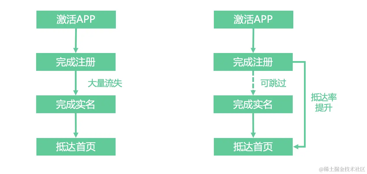 用户从渠道感知到运营商信息,到下载并激活 APP,再到完成注册、实名认证后方可成功抵达 APP 首页。企业 A 通过对用户注册路径进行分析,发现在用户“完成注册”到“实名认证”阶段流失率较高,这一方面是因为用户对企业的信任还未建立,不愿意过多填写个人信息,另一方面可能是因为用户对企业 A 的产品使用意愿并不强烈。但无论是哪一个原因,我们都可以清晰地了解到“实名认证”流程对用户的流失有较大影响。 在了解以上情况后,企业 A 将“实名认证”流程进行优化,调整其为可跳过的步骤。此后,首页抵达率明显提升。