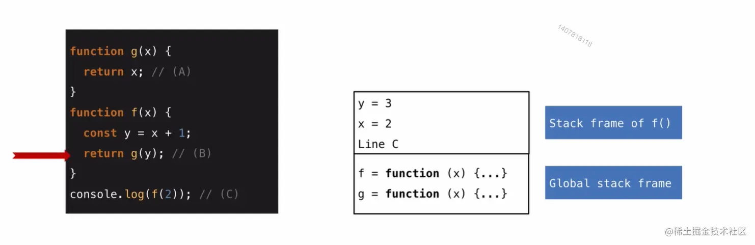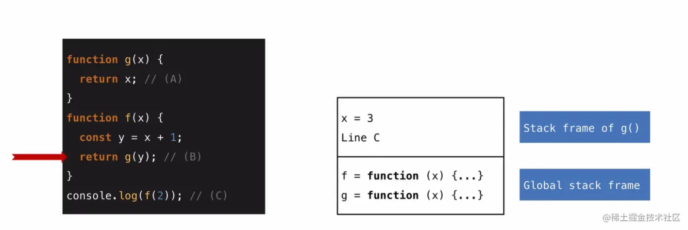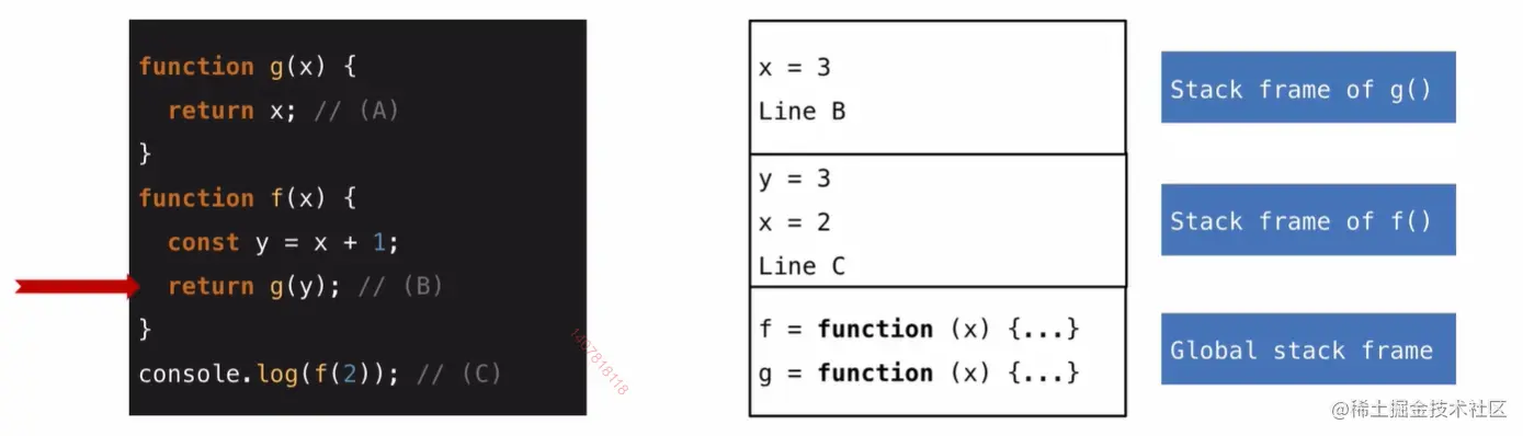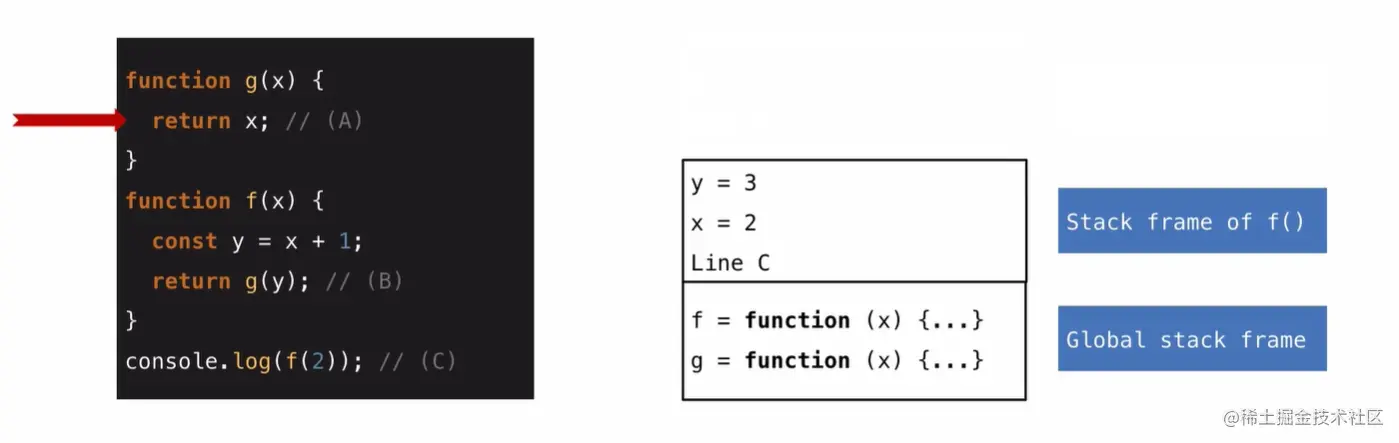 当代码执行到a行时,他返回了x,之后就会移除函数g的frame ,然后回到第b行,