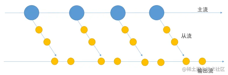 总体上来说,四个操作符的作用都是:存在一个主流和一个从流,主流上每发射一次数据都会触发从流开始发射数据,最后数据都被打平到同一个输出流中,如下图所示。