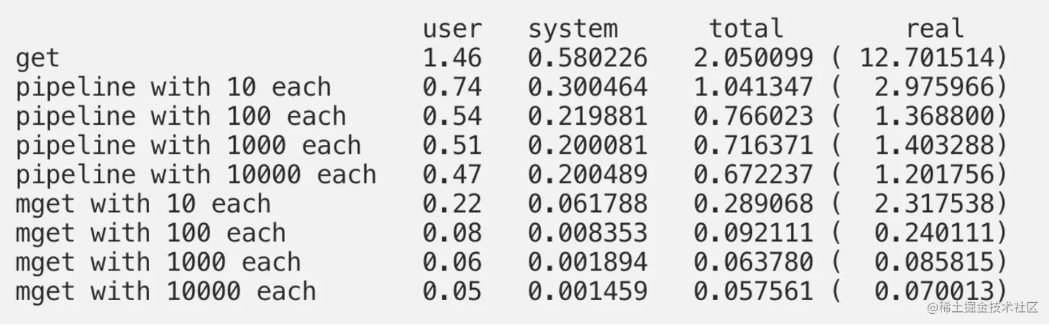 有人为此使用 benchmark 做了个使用比较两者的性能。数据量为一万条。通过比较real的大小,可以看到pipeline 比 get 快了12倍,mget 比 get 快了180倍。
