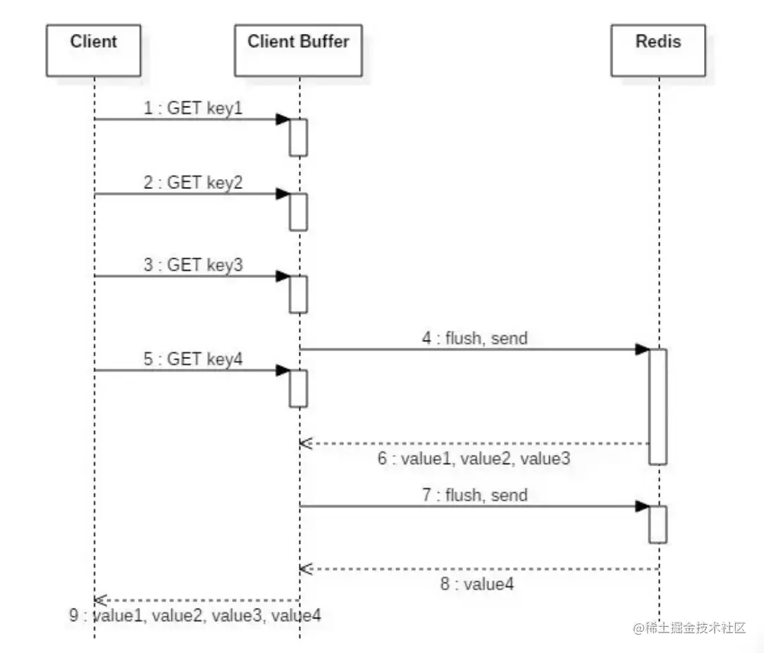 Redis基于Request/Response协议,客户端与服务器端建立连接可能很快或许很慢,不管怎么说,网络延迟的时间是客户端发包给服务端,然后服务端发送响应给客户端,这个一来一回的耗费时间就是 RTT (Round Trip Time) 。