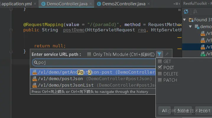 快速跳转到Restful Api处( use: Ctrl(Command) + or Ctrl + Alt + N )