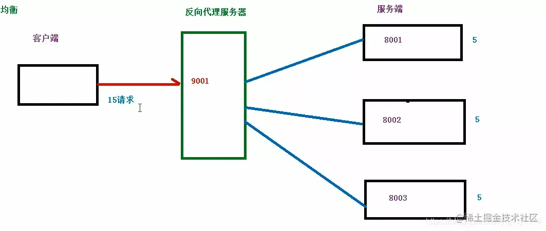 假设有15个请求发送到代理服务器,那么由代理服务器根据服务器数量,平均分配,每个服务器处理5个请求,这个过程就叫做负载均衡