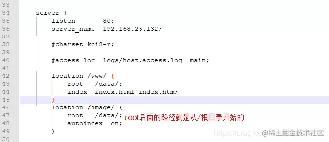 - ^~:用于不含正则表达式的url前,要求ngin服务器找到表示url和字符串匹配度最高的location后,立即使用此location处理请求,而不再匹配